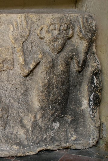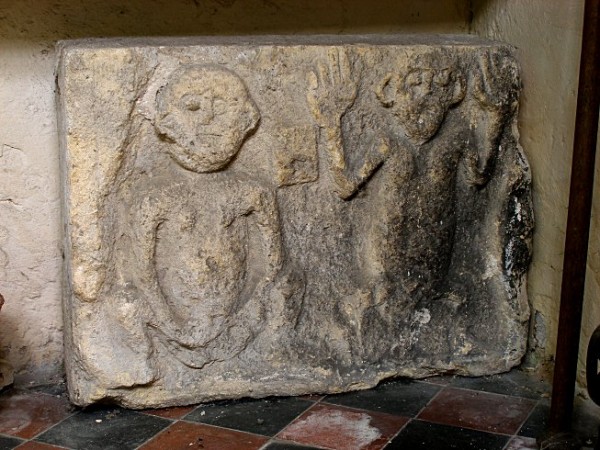 The sculpture consists of a loose slab which at the time of writing was stored in the vestry under a shelf. It shows a male and female figure carved in relief with an ill-defined square floating between them. Both figures are jug eared and the male figure's hands are over large.